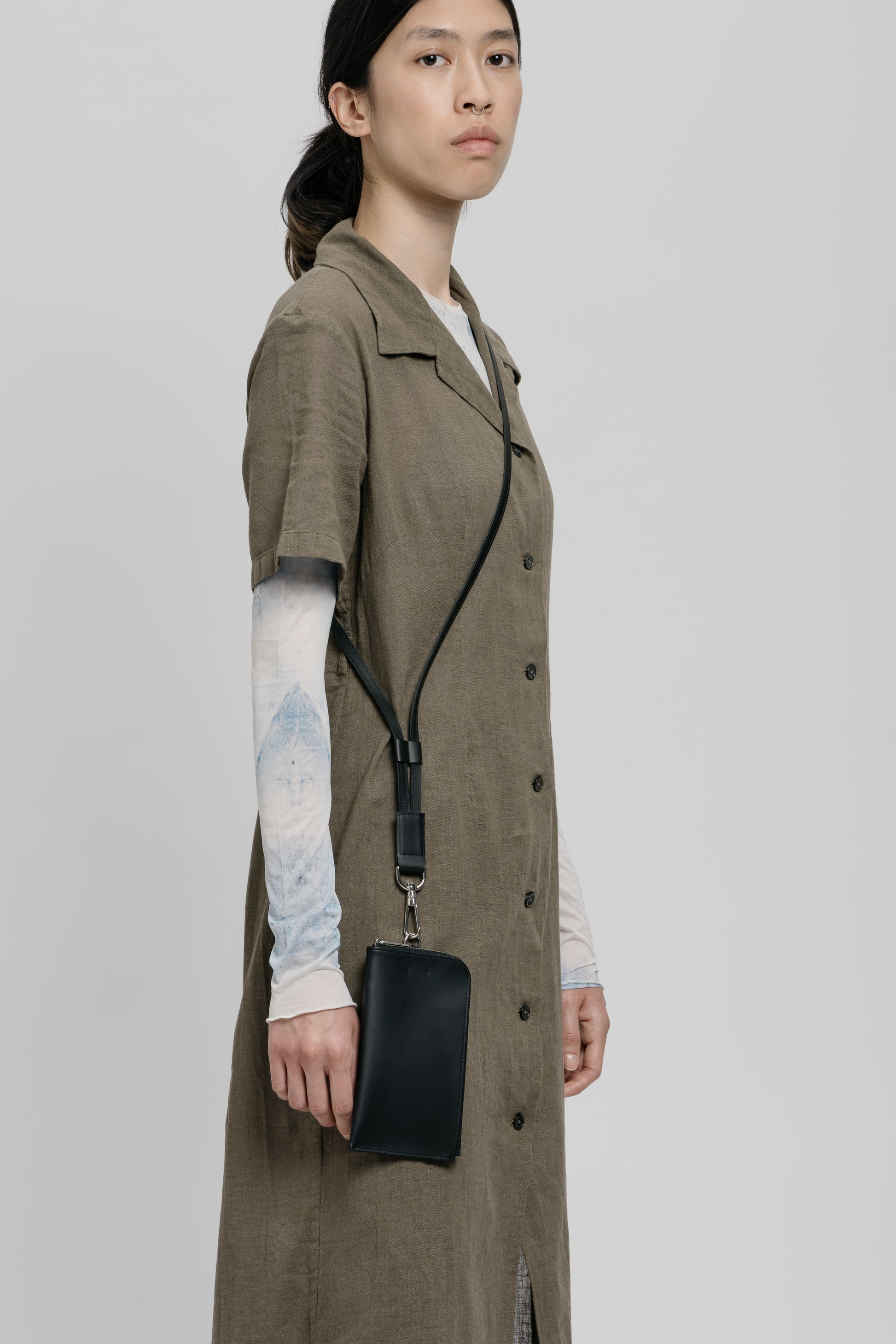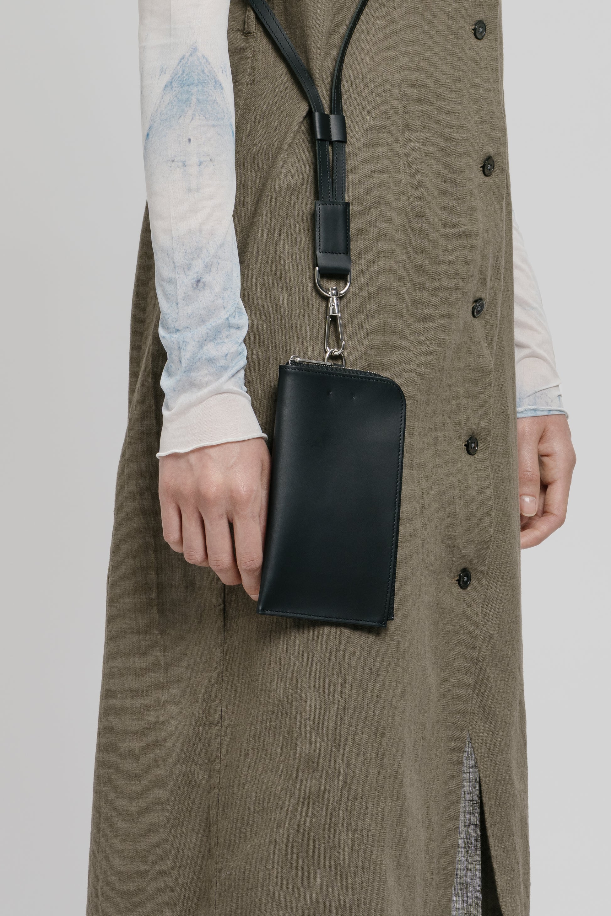 One inspiration for the ensemble of products that can be worn very close to the body is certainly the realisation that the mobile phone is moving ever closer to us in many respects. One could get the impression that it is becoming a new limb. If this is the case, we would like to offer a beautiful, restrained form that also integrates a wallet.