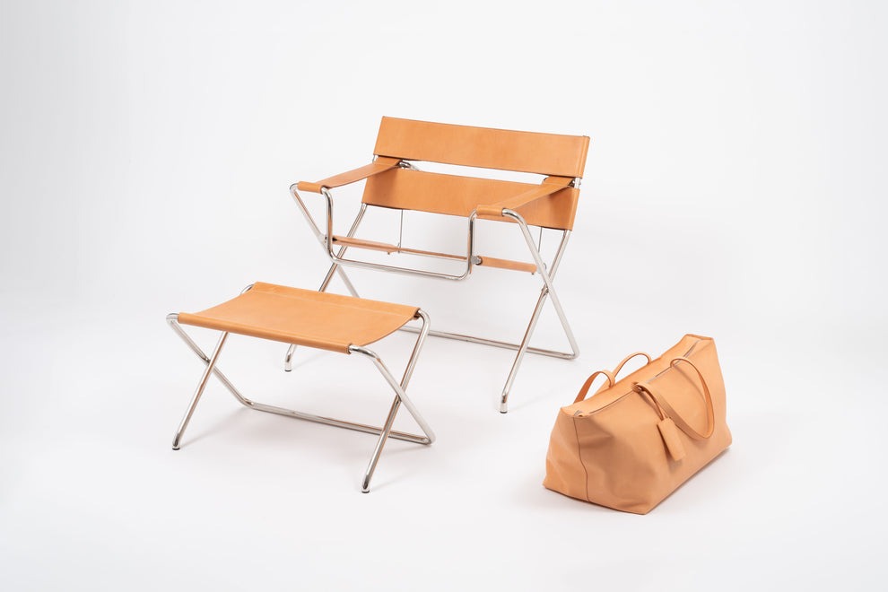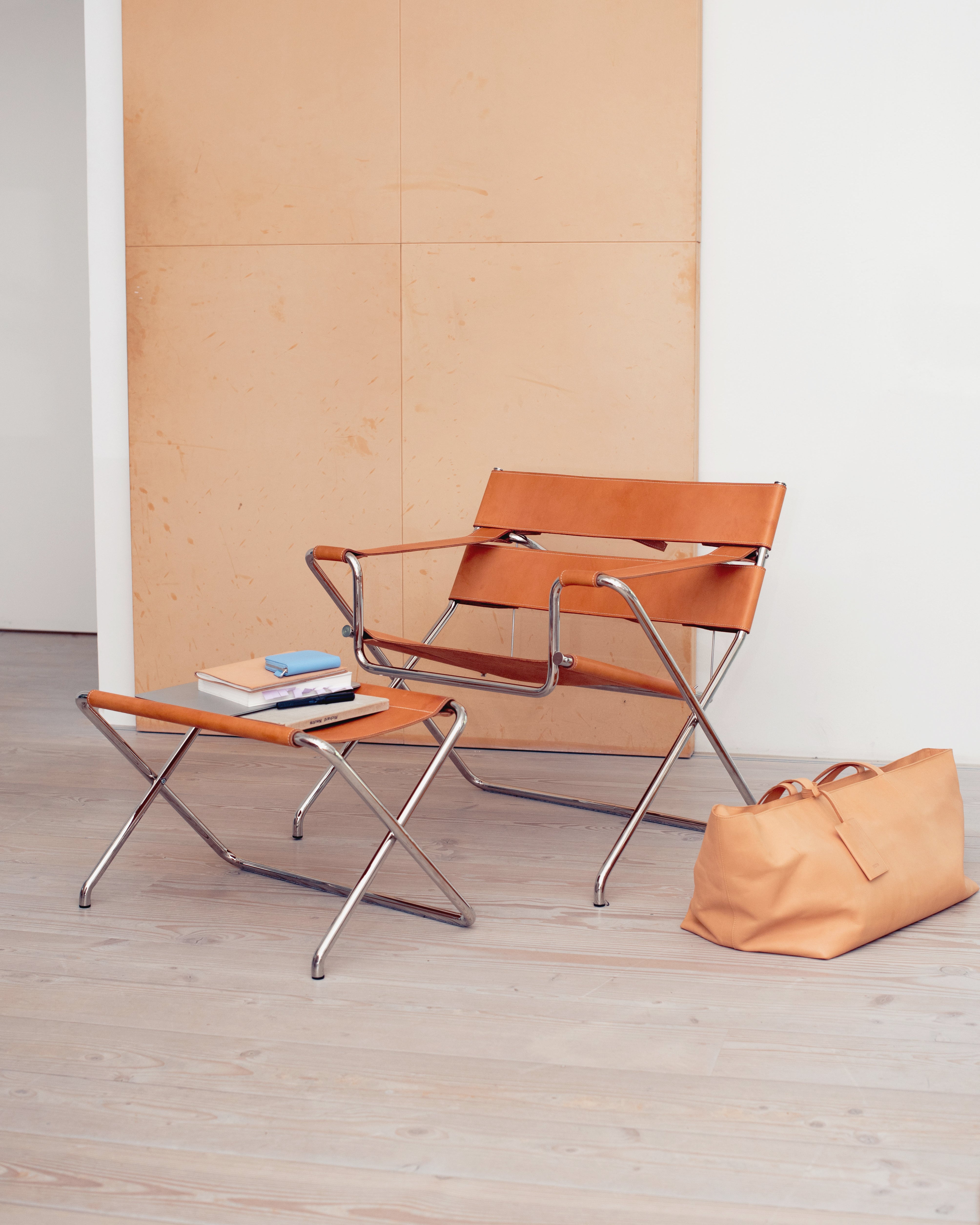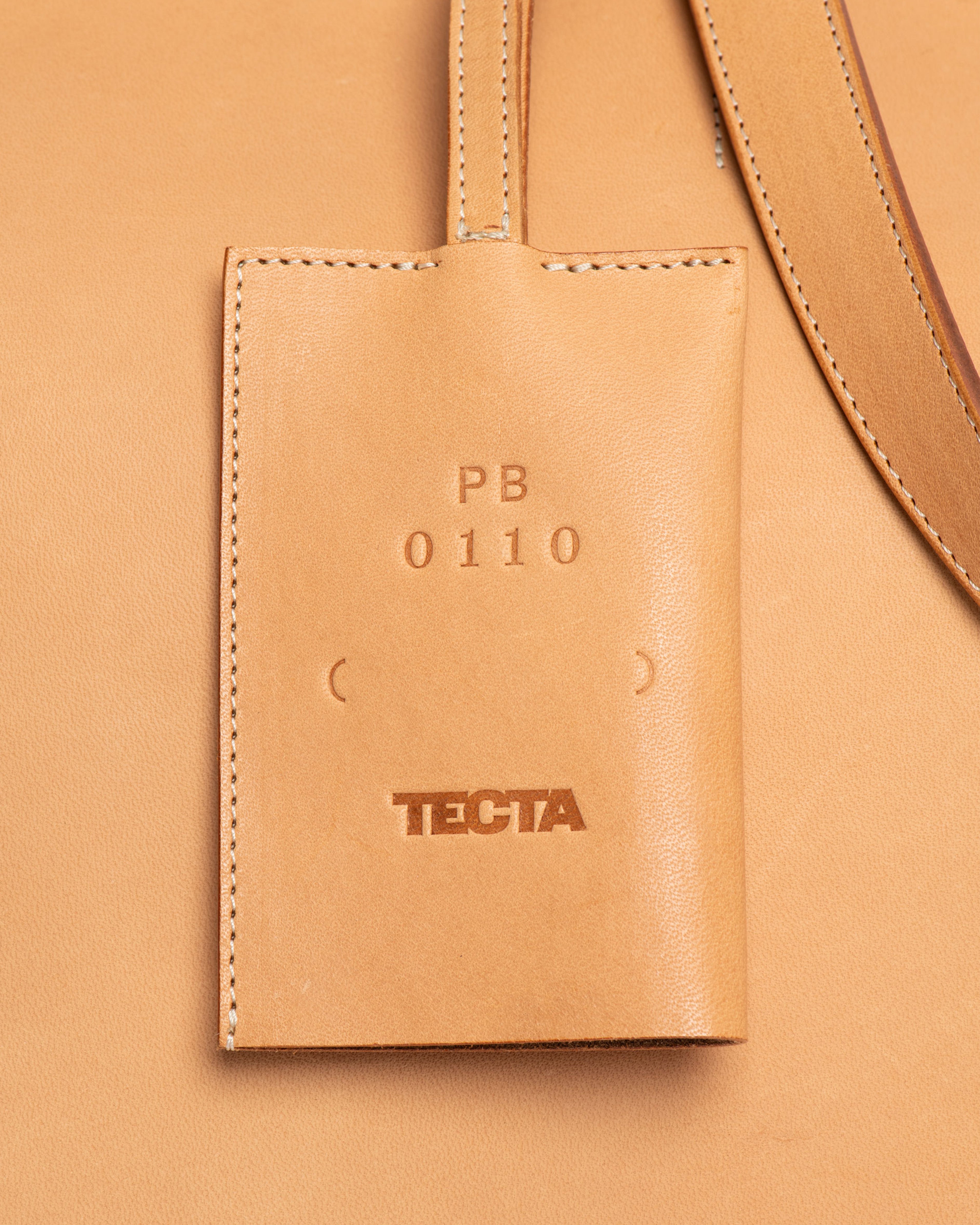 Der Arbeitstitel der Zusammenarbeit zwischen der deutschen Möbelmarke TECTA und PB 0110 war ‚Home Work‘. Uns leitete der Gedanke, wie wir heute zu Hause arbeiten und wie sich die Orte und Arbeitssituationen über das letzte Jahrzehnt signifikant verändert haben. Ein Ensemble aus drei Objekten ist entstanden: Der zusammenklappbare Stahlrohr-Klubsessel D4 von Marcel Breuer aus dem Jahr 1927, bezogen mit unserem Leder, ein neuer mobiler Hocker und eine Beistelltasche, die wie ein Objekt im Raum steht und als Möbel oder Reisetasche von Raum zu Raum oder längere Reisen funktionieren kann. Für das Design der neuen Elemente habe ich die Münchner Künstlerin und Designerin Ayzit Bostan eingeladen.