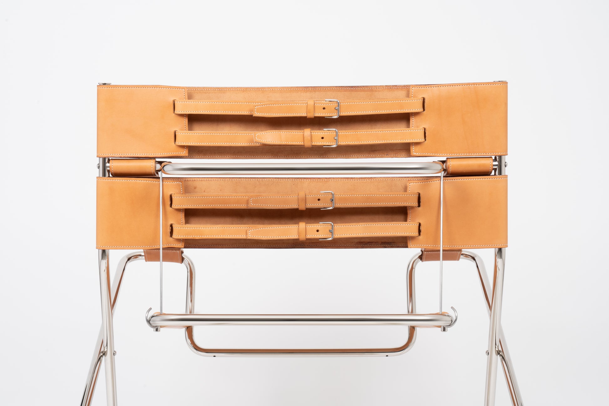 Der Arbeitstitel der Zusammenarbeit zwischen der deutschen Möbelmarke TECTA und PB 0110 war ‚Home Work‘. Uns leitete der Gedanke, wie wir heute zu Hause arbeiten und wie sich die Orte und Arbeitssituationen über das letzte Jahrzehnt signifikant verändert haben. Ein Ensemble aus drei Objekten ist entstanden: Der zusammenklappbare Stahlrohr-Klubsessel D4 von Marcel Breuer aus dem Jahr 1927, bezogen mit unserem Leder, ein neuer mobiler Hocker und eine Beistelltasche, die wie ein Objekt im Raum steht und als Möbel oder Reisetasche von Raum zu Raum oder längere Reisen funktionieren kann. Für das Design der neuen Elemente habe ich die Münchner Künstlerin und Designerin Ayzit Bostan eingeladen.