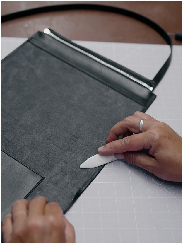 The balanced strap length ensures PB 1 is comfortable to carry in any state. Material and Craftsmanship Made from 1.1 m² of soft, vegetable-tanned leather, PB 1 reveals the natural beauty of the material over time. We deliberately omitted a lining to reduce weight. The reverse side of the leather is specially treated to maintain a smooth, refined surface. Protective piping along the edges adds structure and ensures durability.