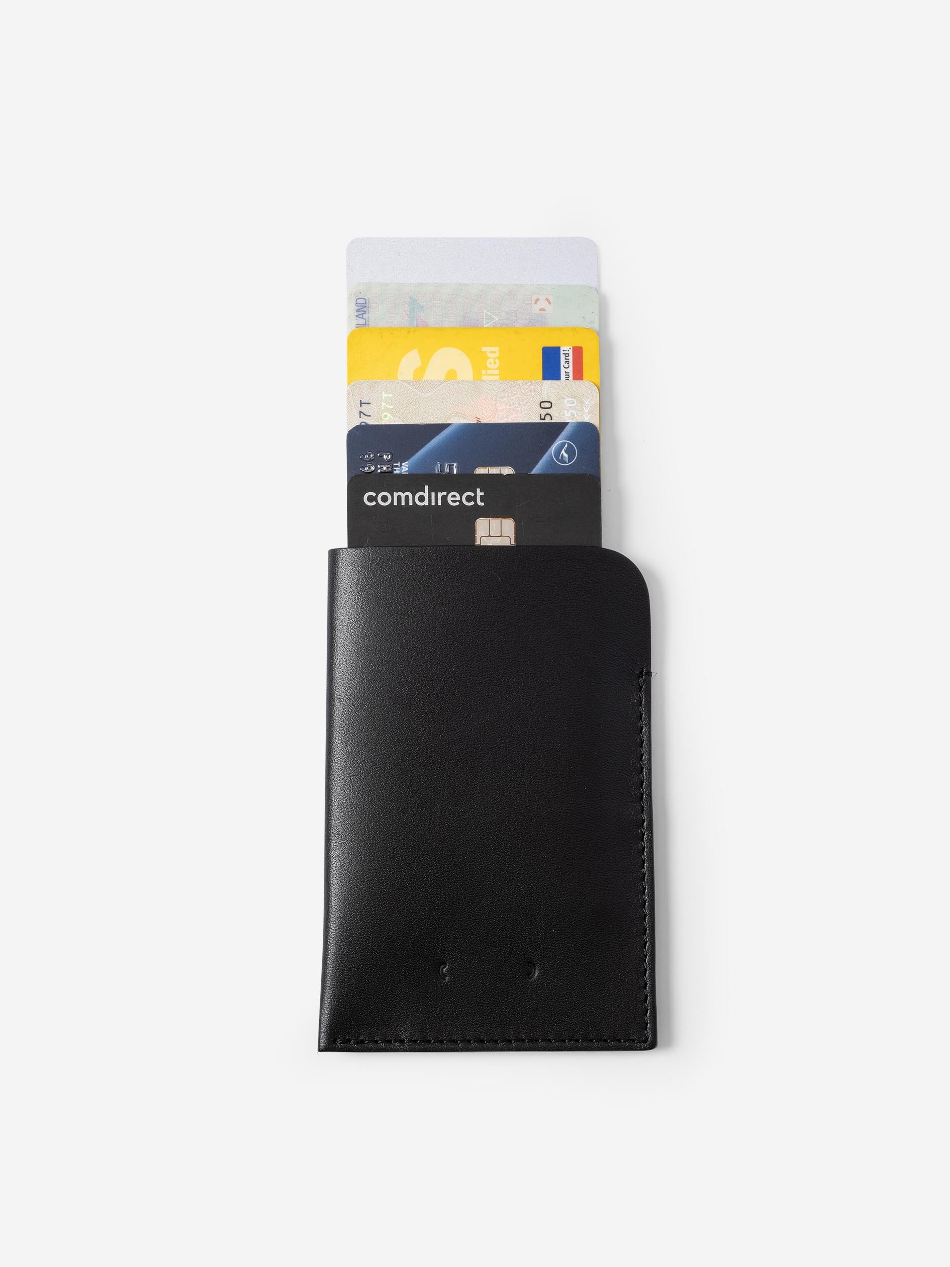 This cardholder offers space for at least five credit cards and folded bills. Thanks to its well-thought-out proportions and rounded opening, the cards can be easily accessed, making handling significantly easier. A separate inner compartment ensures that bills are neatly stored and don’t mix with the cards. It feels very comfortable in the hand and fits compactly in your pocket."