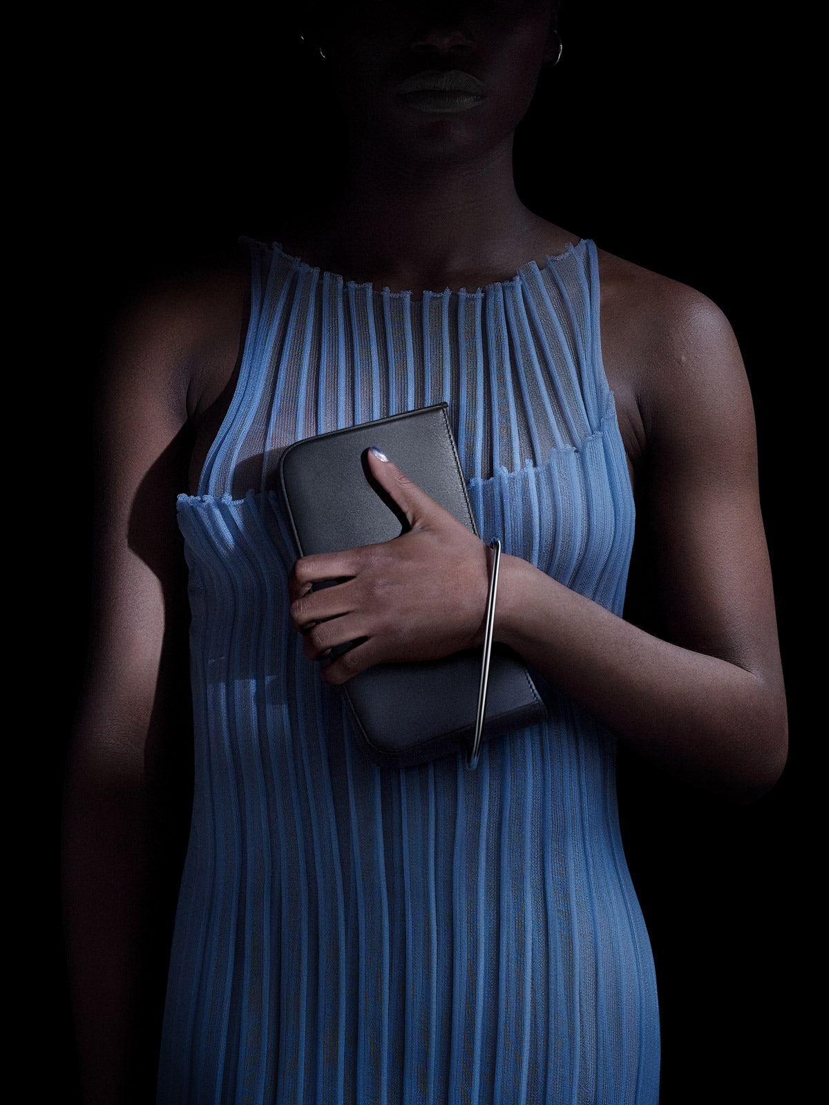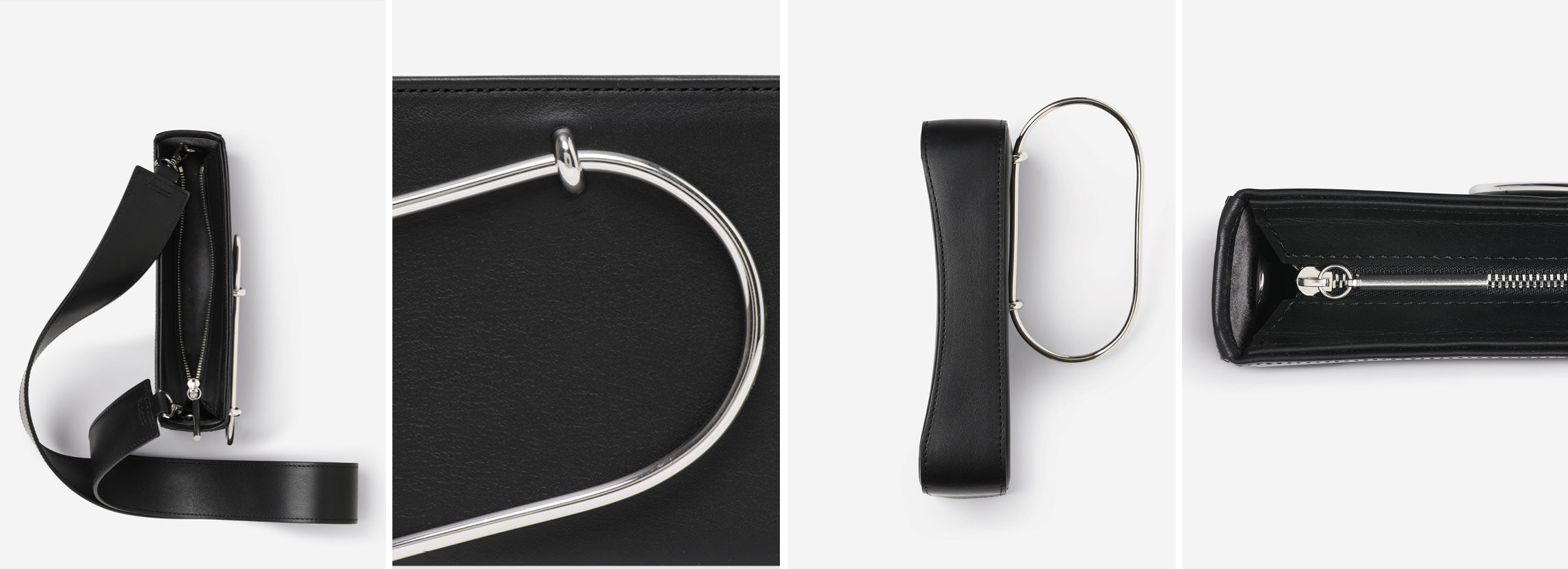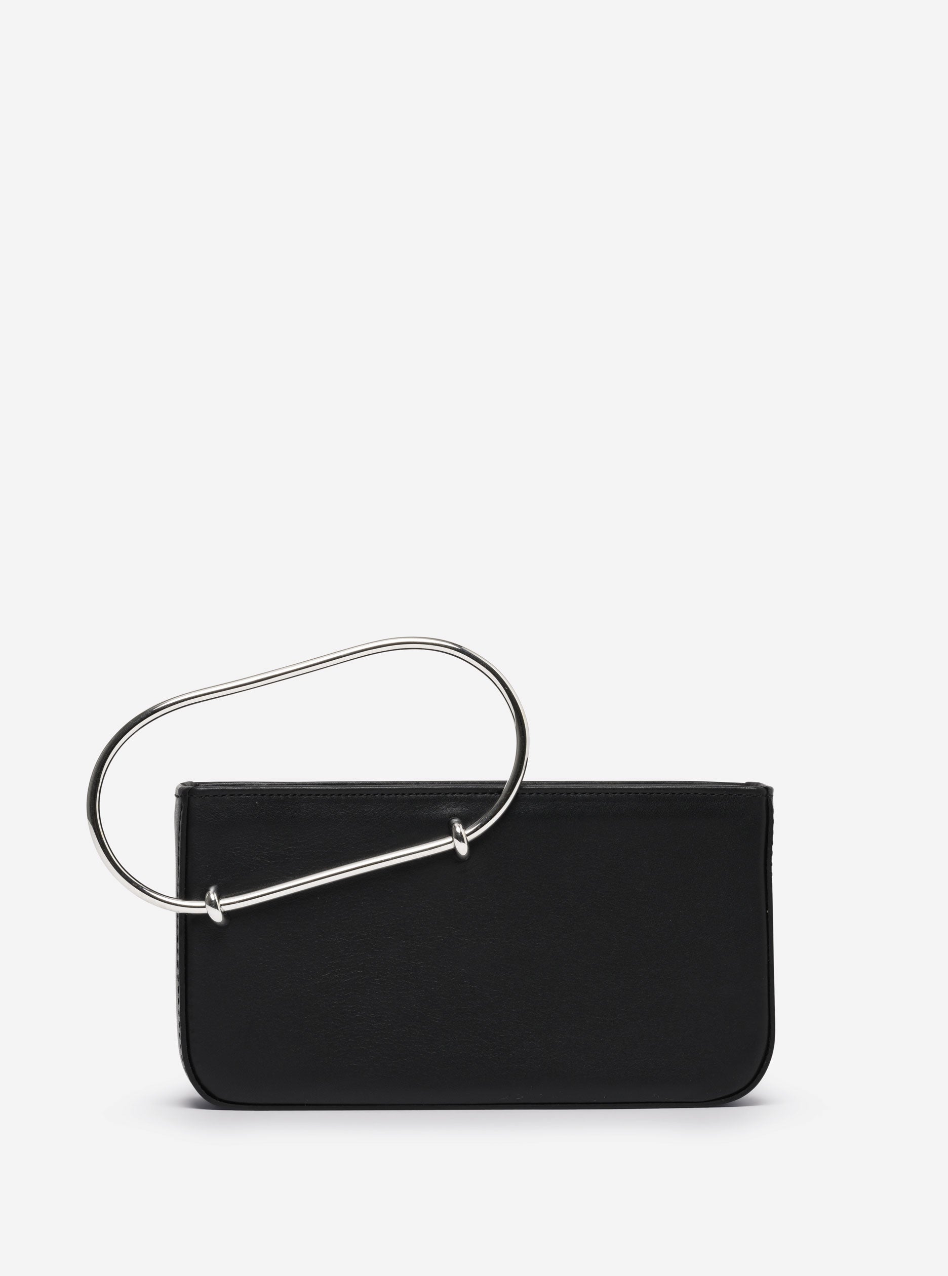 The clutch combines the worlds of leather goods and jewellery and can be worn in many different ways. The smooth, polished metal handle becomes a bracelet, while the curved shape of the leather allows the hand to rest in negative space or hugs the body as a cross-body bag.